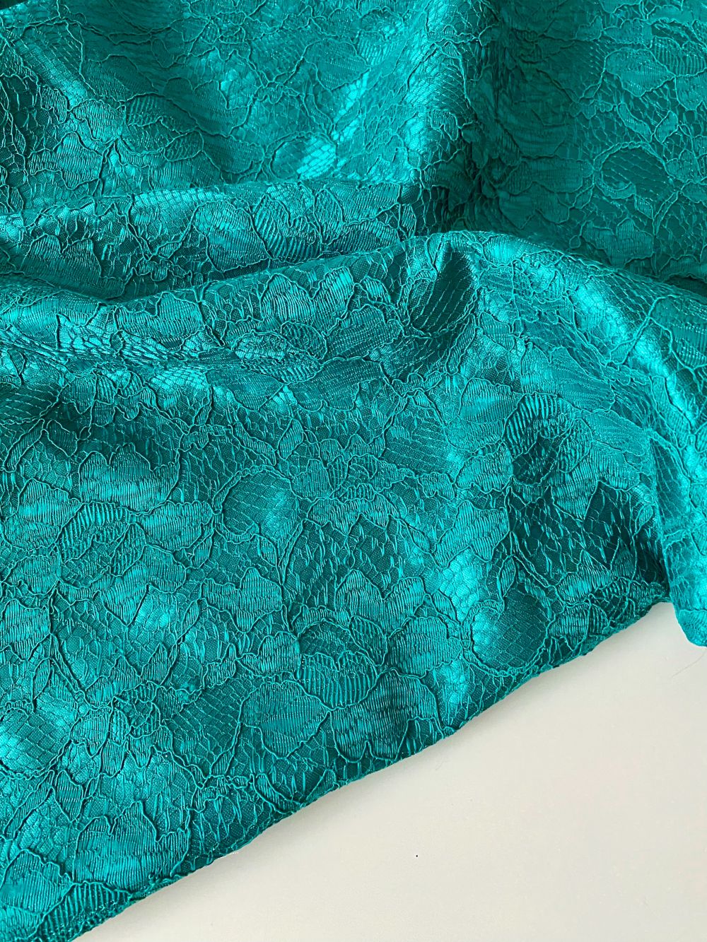 Гипюр на атласе темная бирюза